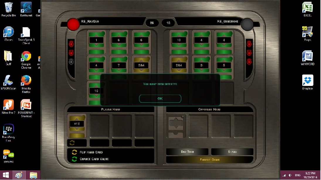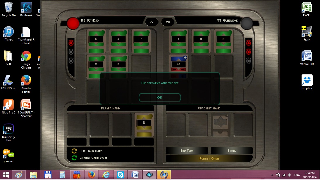 10-29-14 Pazaak. Ray and Jaran. Jaran won 2/3 games.