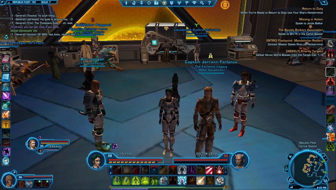 Ray and Jaran: did jarans class quest on Tattoine (Bait), finished his class quest on Nar Shaddaa (The Endless Abyss), Finished Chapter One (you cant spend infamy). Ray's class quest was The Justice, where we defeated Tavus (what a jerk), and back on the fleet, completed Time Off. Also hit the trainers and the crew skill trainers.
