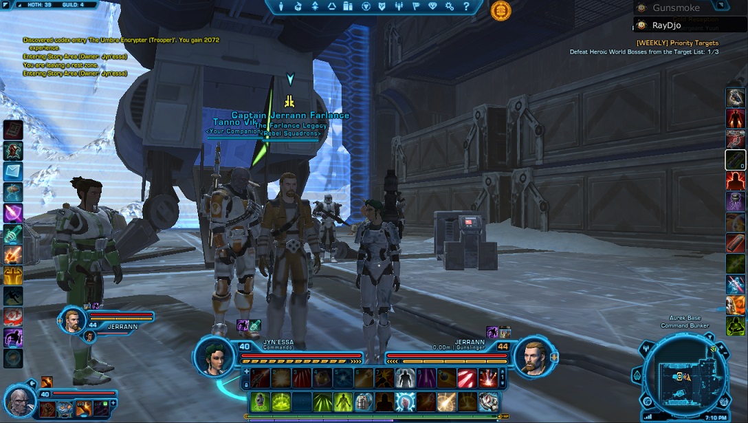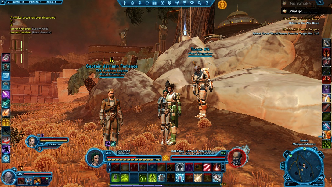 Ray finished Quesh with Jaran's help. Worked on planetary quest Rescue Operation with bonus missions siege breaker and medic alert; and completed Ray's class quest Reclaiming Quesh. then we traveled to Hoth.