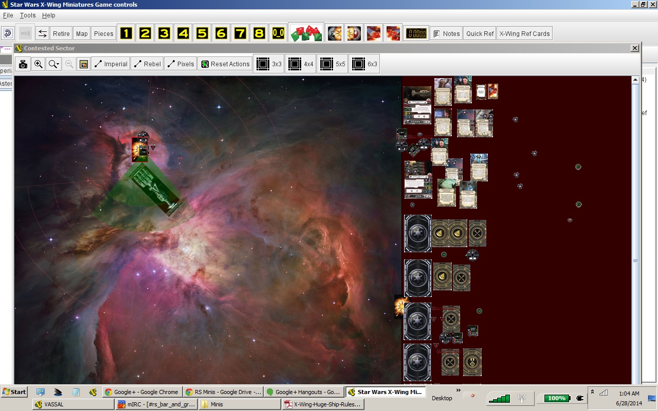 S.S. Sconn-mobile (Corellian Corvette) vs. TIE Bombers and Fighters. Sconn wins by crashing into half of the TIES.