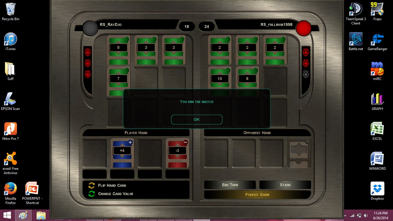 Fulliron and Ray played 2 games of pazaak on 6-26-14. Ray won both matches