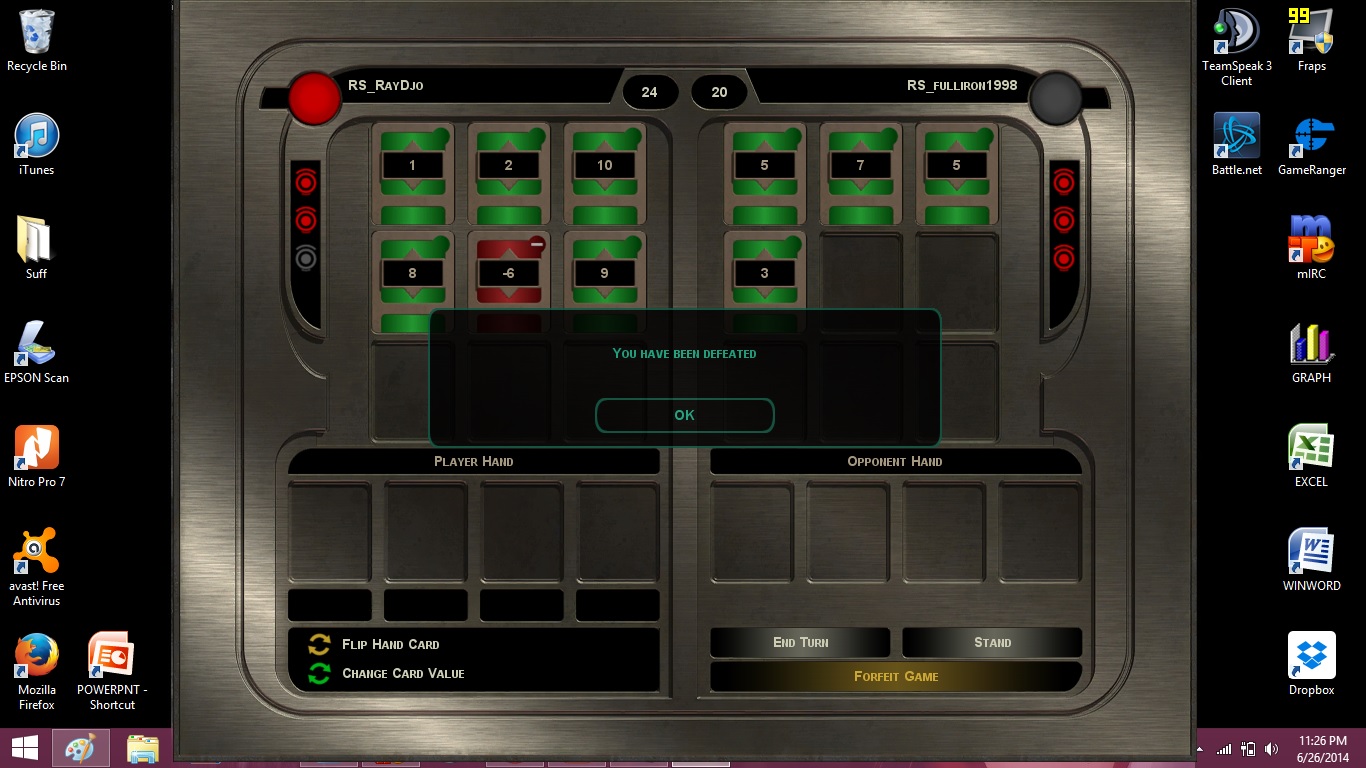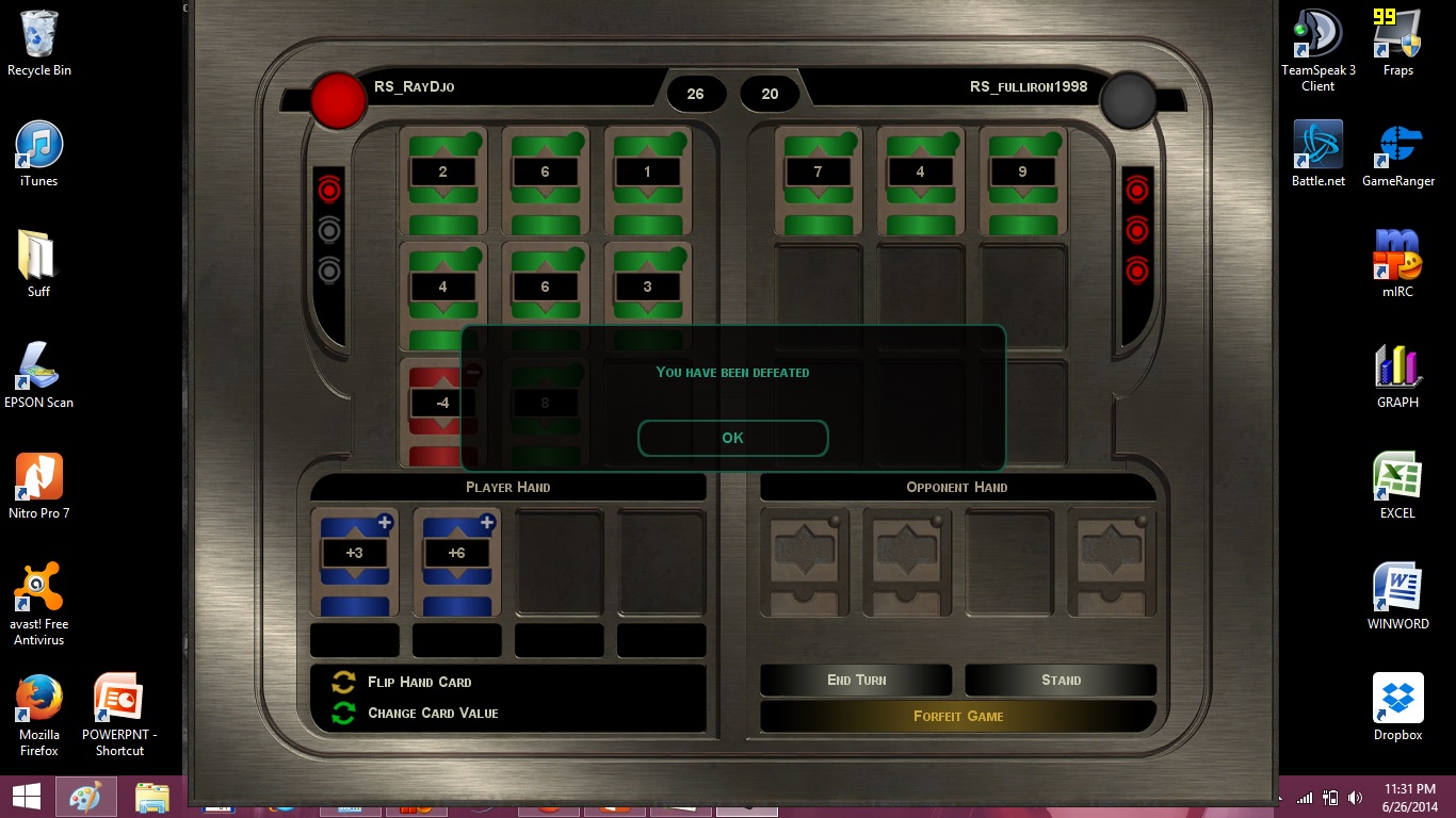 Fulliron and Ray played 2 games of pazaak on 6-26-14. Fulliron won both matches.