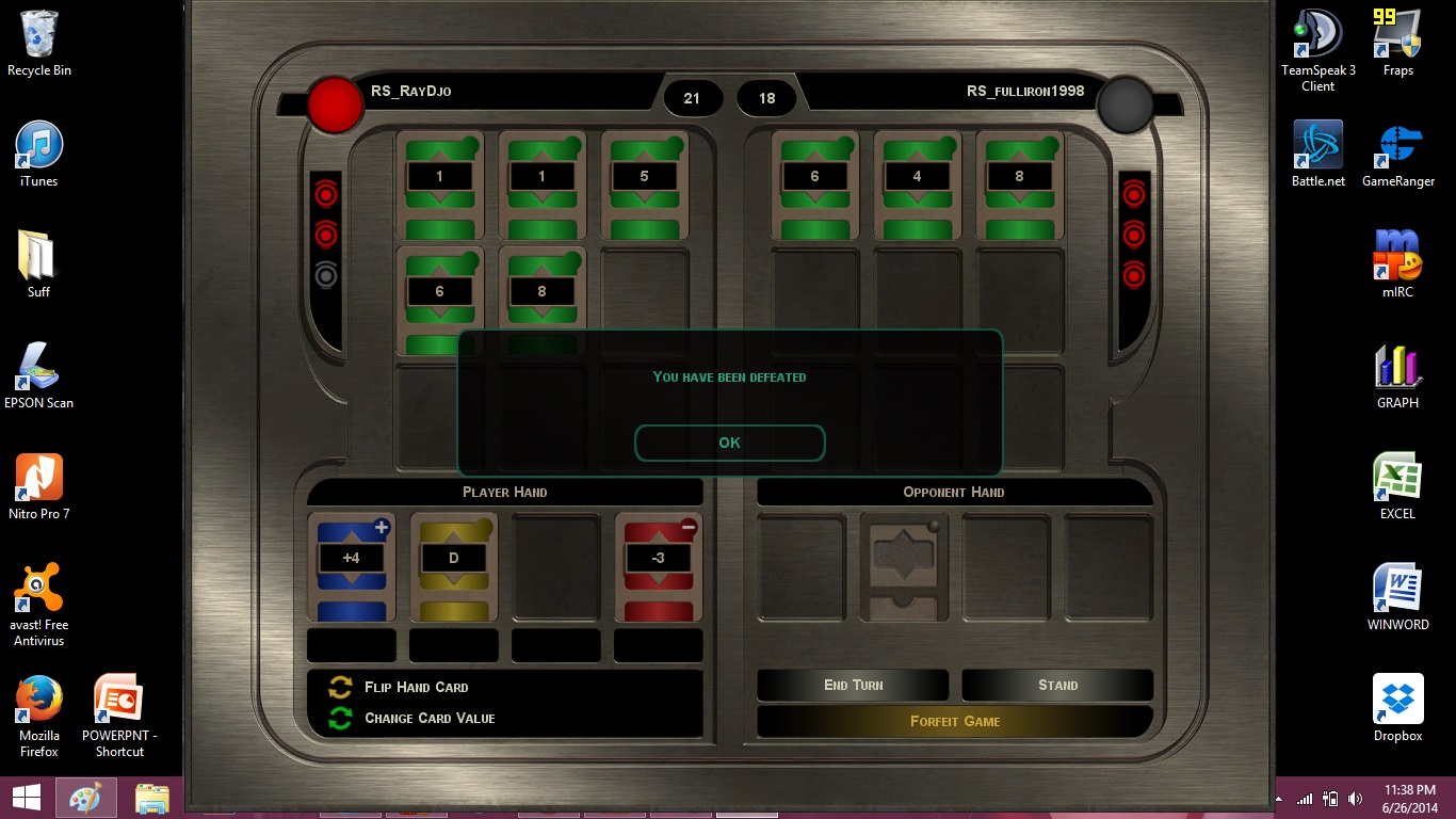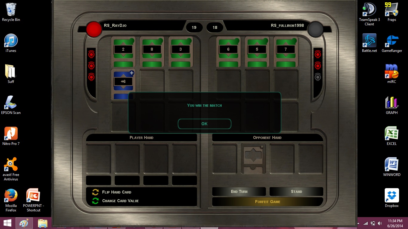 Fulliron and Ray played 2 games of pazaak on 6-26-14. They each won one match.