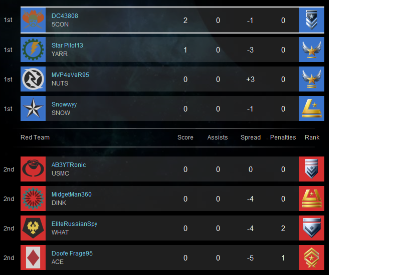| Player | Score | Kills | Deaths |