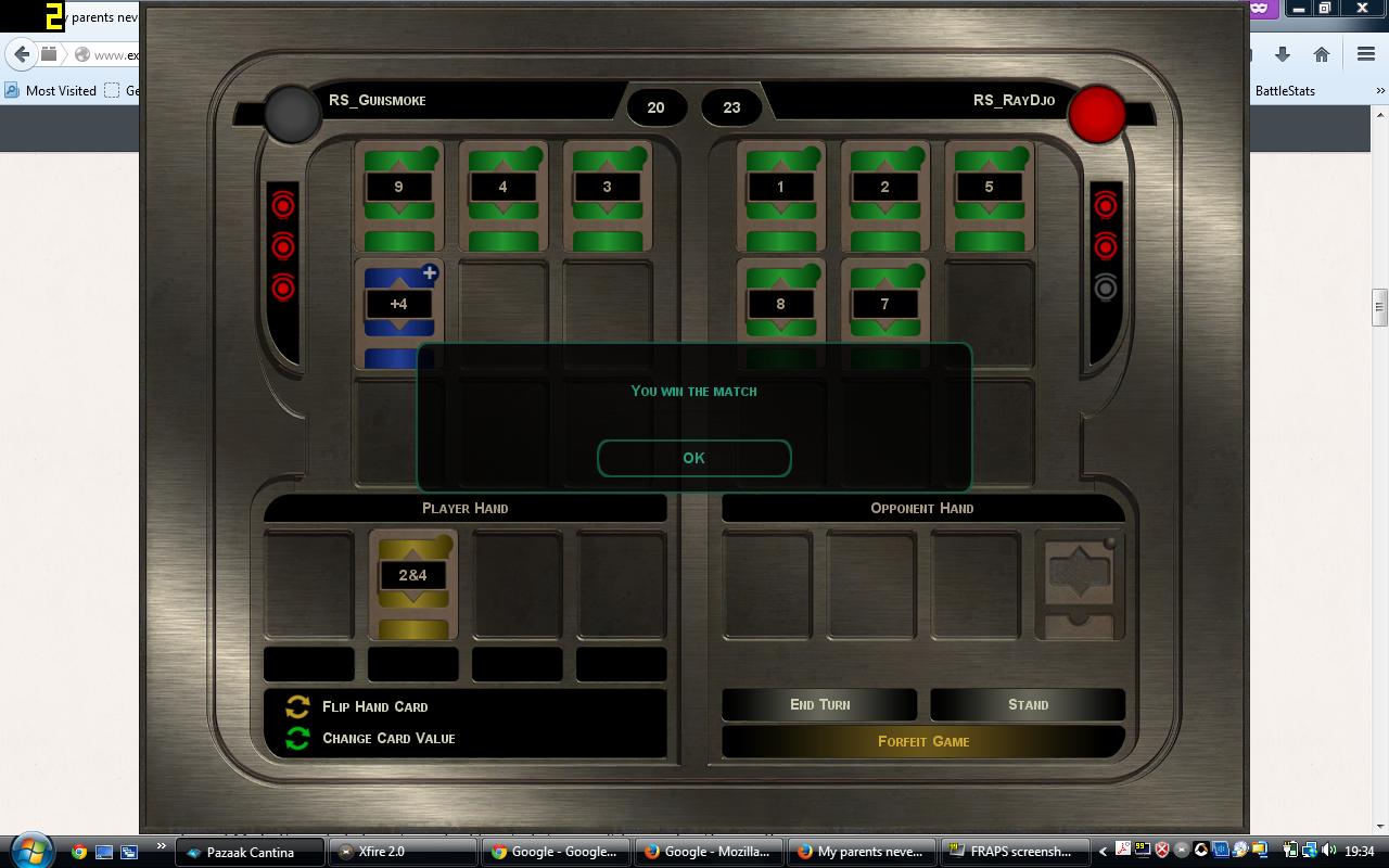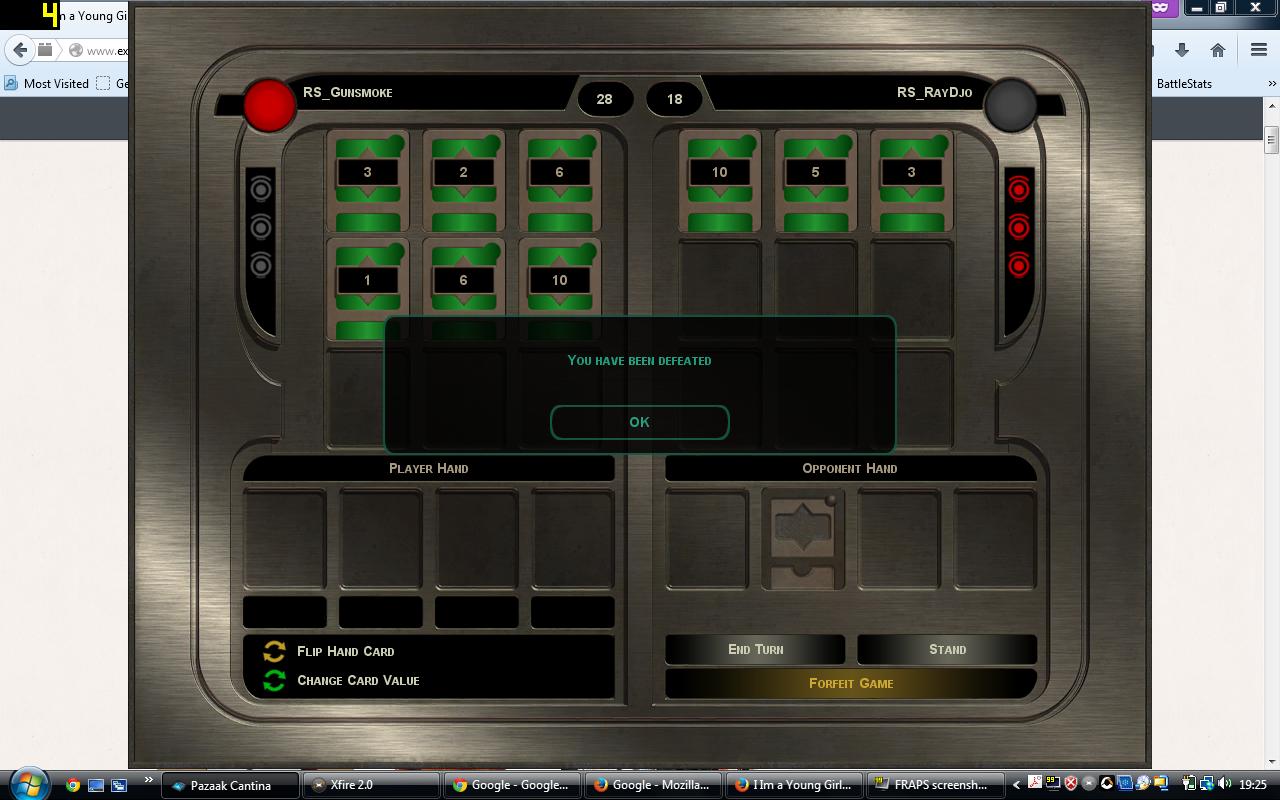 Gunsmoke and Ray Djo played 2 games of Pazaak Cantina resulting in a 1-1 draw
