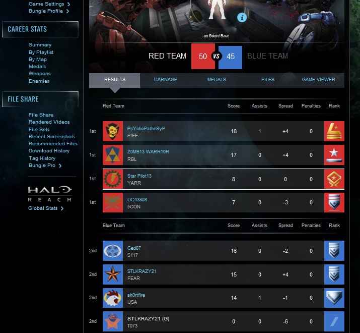 Halo: Reach Swat match. SS obtained from Bungie.net match results page.