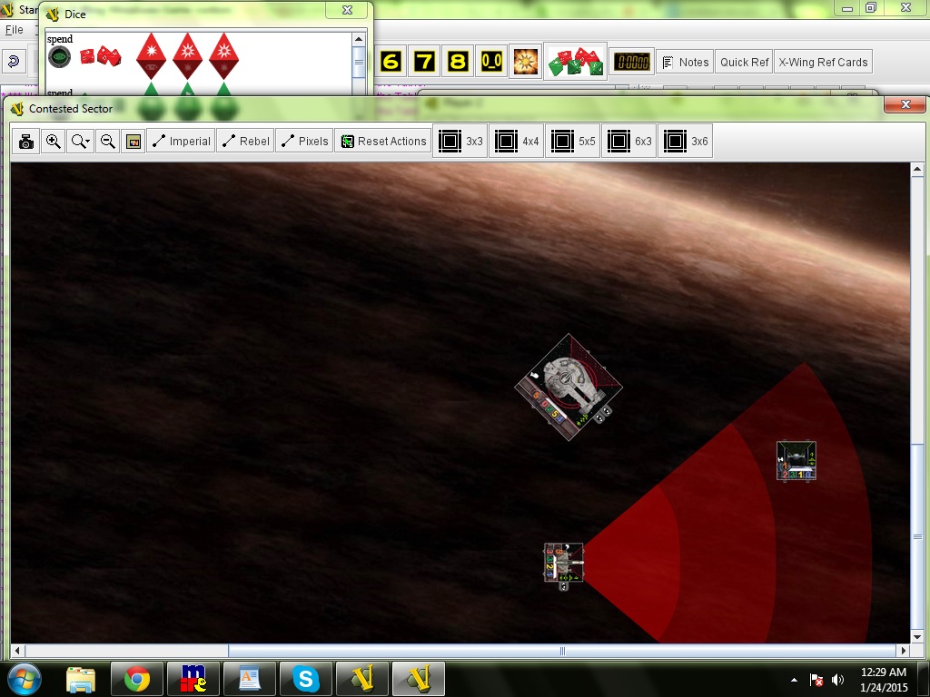 Skirmish - Teu with 5 TIE Fighters and 1 VT-49 vs Nico with an E-Wing and YT-2400. One of Teu's TIEs deserted and the rest met their demise.