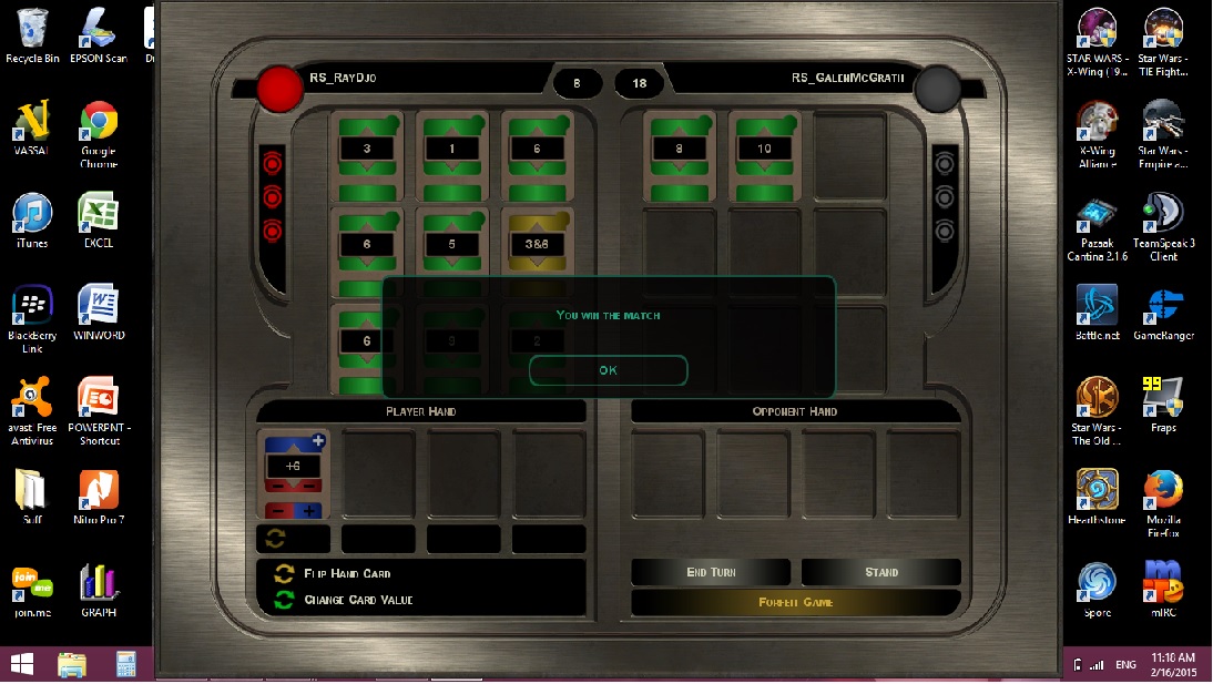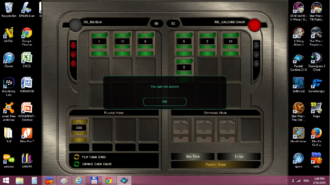 Ray and Galen played 3 games of Pazaak on 2-16-15. Ray won all three games.