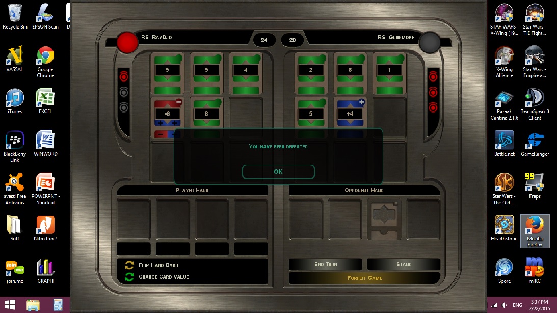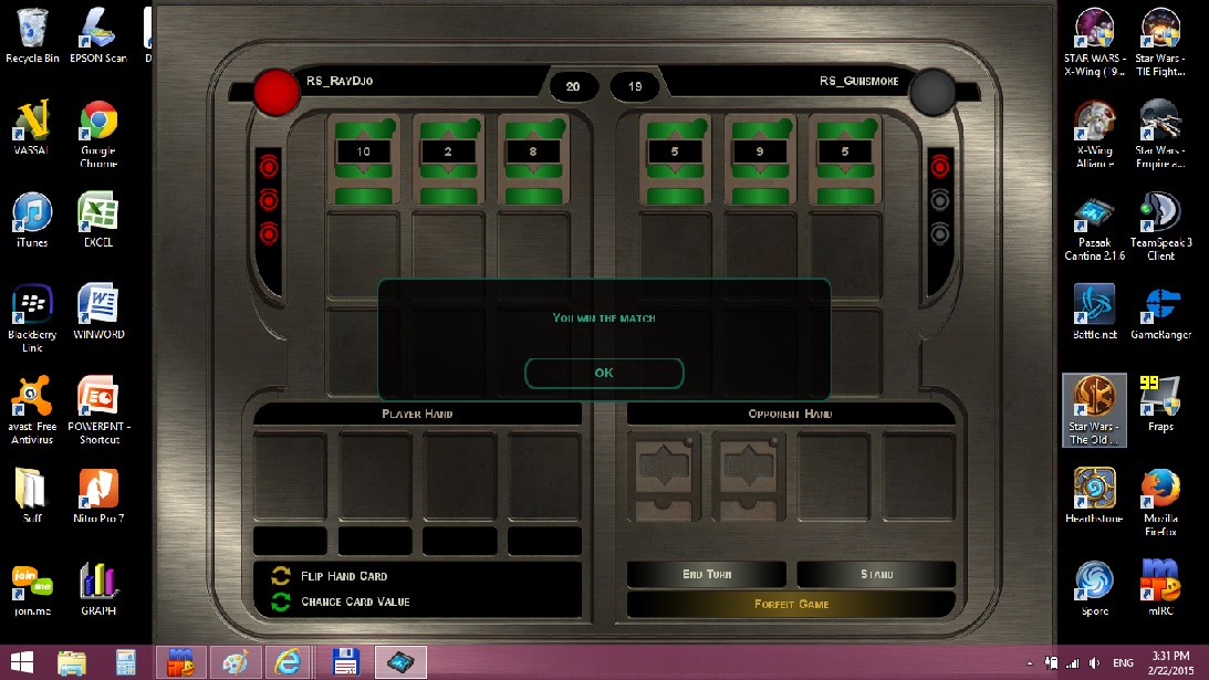Ray and Jaran played 3 matches of pazaak. Ray won 2, Jaran won 1. 2-22-15