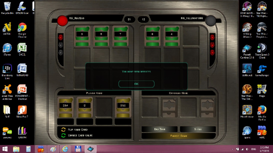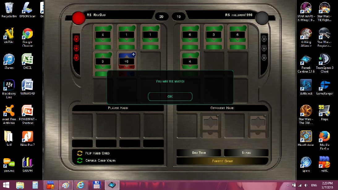 Fulliron and Ray played 3 matches of Pazaak on 3-7-15. Ray won 2 matches, Fulliron won one match.