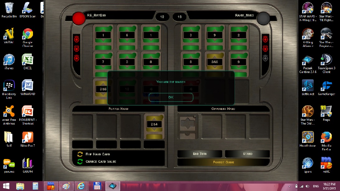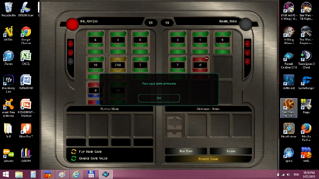 March 27th. Rahm and Ray played 3 games of Pazaak in hopes of last minute points to beat RZA!!! Ray won one match, Ramn won two.