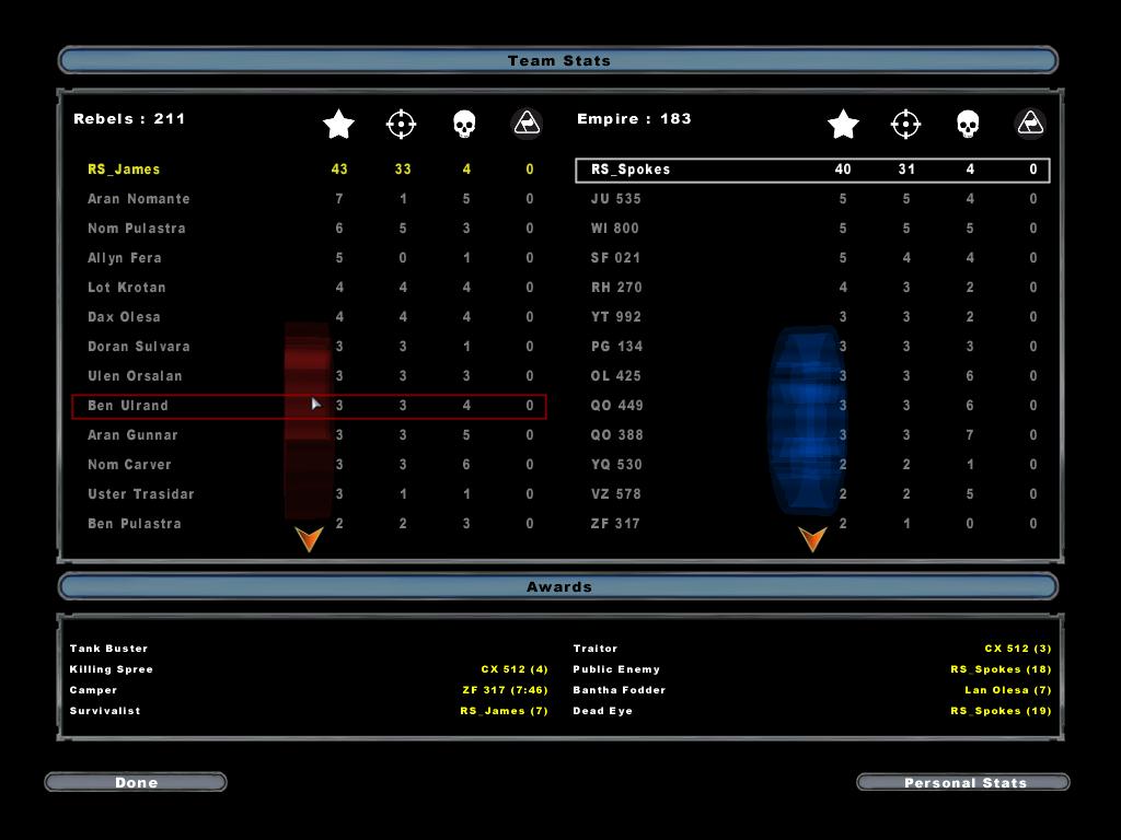 Team Score: Rebels (James) 211, Empire (Spokes) 183