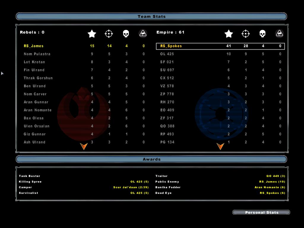 Team Score: Rebels (James) 0, Empire (Spokes) 61