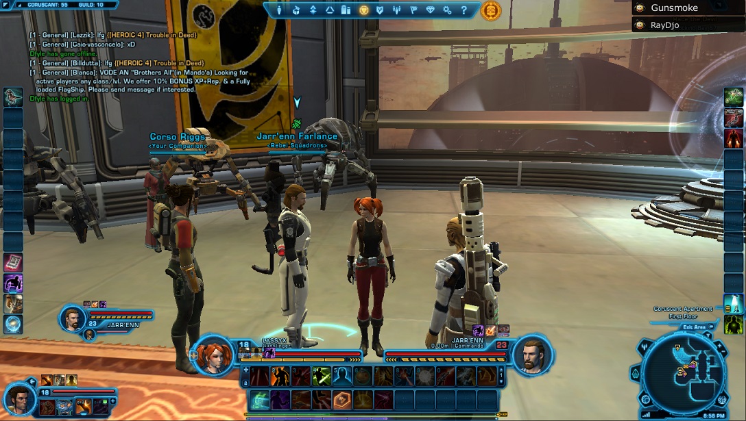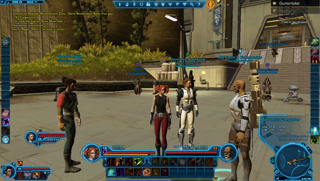 6/12 45 minutes. Lys completed Race the Devil, which constituted getting to the docking bay on coruscant, beating the bad guy, getting her ship, meeting Risha, traveling to Taris, going back and talking to Risha because she didn't realize she had to talk to her a second time, and learned "always check to see if you have to talk to rishi, because if you don't check, it could cost you a good 5 minutes worth of loading screens". -_- also, the smuggler ship is HUGE and it sucks. mostly because I am lost in my own ship. :(