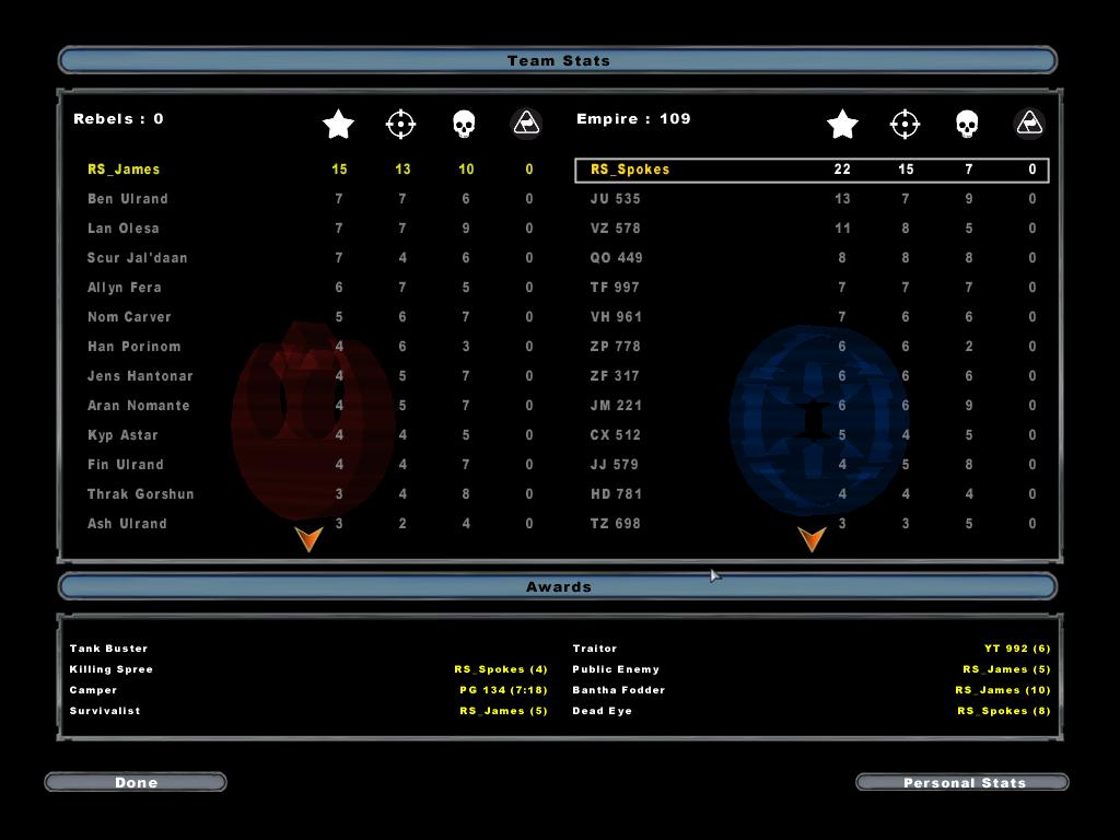Team Score: Rebels (James) 0, Empire (Spokes) 109