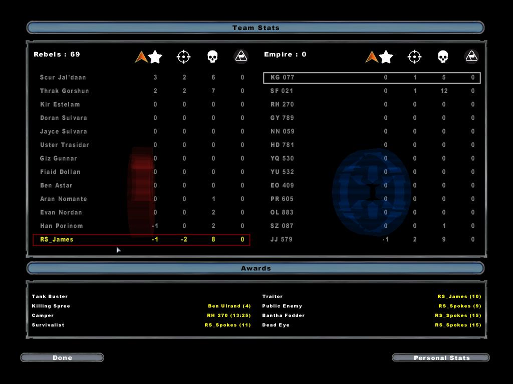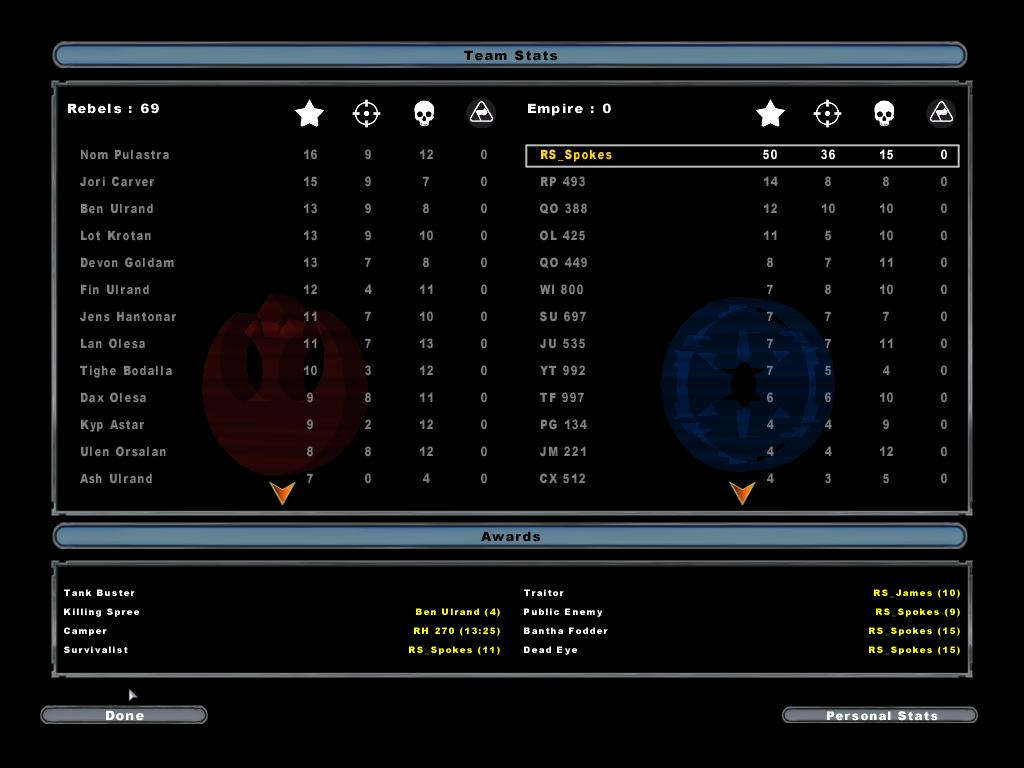 Team Score: Rebel (James) 69, Empire (Spokes) 0