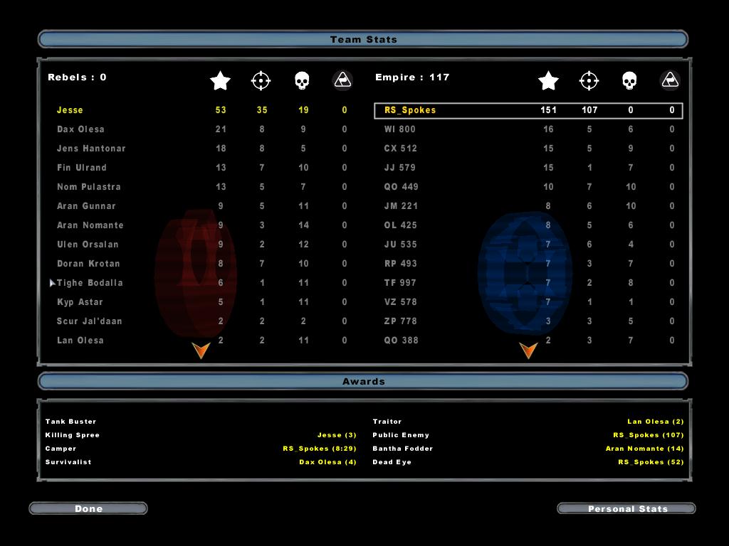 Team Score: Rebels (James) 0, Empire (Spokes) 117