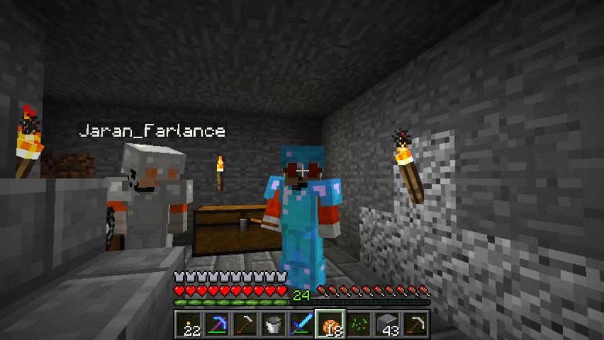 Found a stronghold, mined a metric crapton, and came back. Jaran then went spelunking and lost fully enchanted gear when he got ambushed by a witch and her cadre of zombies and skeletons. He is mourning his gear, and his lost 38 levels of enchanting xp.
