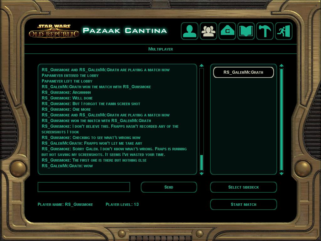 I played Pazaak with Galen for one hour and fifteen minutes. I'm not sure what's up with fraps but it wouldn't let me take screen shots towards the end of our games. We played 11 matches with Galen winning 6 games to 5. I could only take the final screen shot from the lobby but Fraps records the timestamp in it's file format. If you check the screen shot titles you will see that we DID indeed play for the time stated. You have my word on this and I take any accusations of cheating as seriously as everyone else here. Please accept these screenshots as proof of the time stated. Jaran.