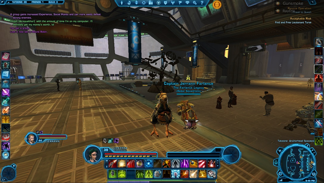Started out on tattooine. Did Ray's companion Quest for Jorgan: Acceptable Risk. Did Jaran's companion quest for Corso: In a Pickle.
