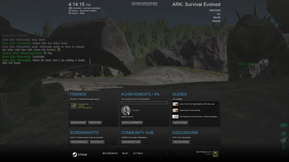 Eric logged in and noticed a level 130 Spinosaur near our base. We decided to try and take it down. After Eric got eaten (by being brave enough to get close to it to get its attention), we managed to knock it unconscious with tranquilizer arrows fired from our new crossbows.
