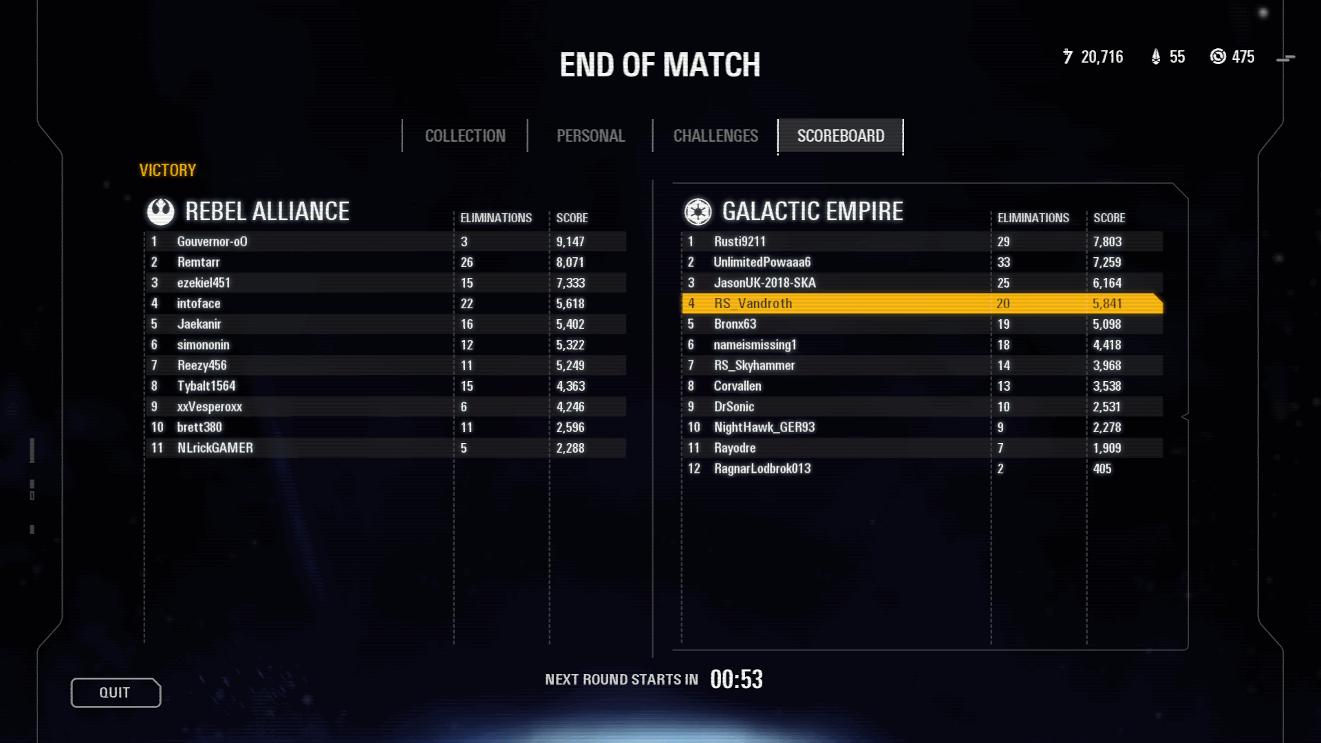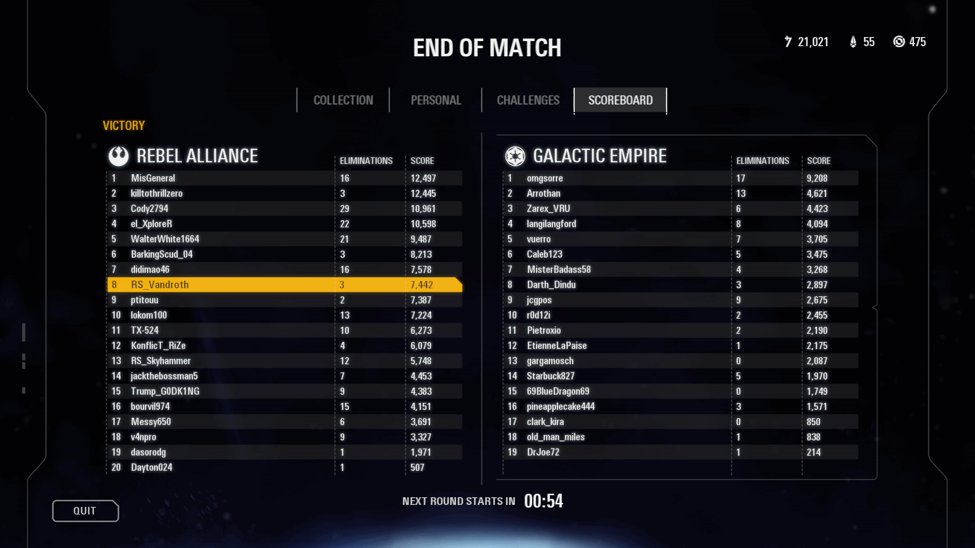 Second set of matches with Cyrel and Skyhammer. Fourth was Starfighterz, and fifth was Galactic Assault where we successfully defended Hoth from the Empire (even with Nerfed Explosive Sentry!). Take that, AT-ATs.