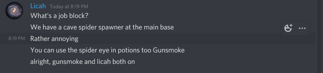 Spent time landscaping and started building an XP farm out of a spider spawner I found. Solo Play finished when Licah joined in hence only 1 hour.