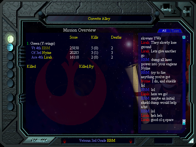 Finally a victory on this mission. Amusingly, the entire horde of TIEs chased me while Licah picked at a Strike Cruiser. I barely escaped into hyperspace after a lengthy (and aborted) loop to lure the TIEs back to Licah. He then fell to the horde.